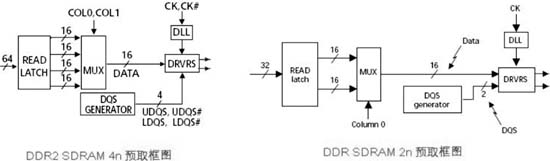 * 4n数据预取 DDR SDRAM的数据预取能力是2,即芯片内部能以2倍于时钟运行的速度预取数据,从而使得芯片内核工作频率仅需要为外部数据传输率的一半。DDR2 SDRAM的数据预取能力是4,即芯片内核工作频率仅需要为外部数据传输率的1/4。而对于SDRAM,芯片内核工作频率等于外部数据传输速率。所以在同样的内核频率下,DDR SDRAM的数据传输速率比SDRAM高一倍,而DDR2 SDRAM的数据传输率比DDR SDRAM又高一倍。 例如,DDR2和DDR1 SDRAM的外部数据传输率都为400Mb/s的情况下,对于DDR2 SDRAM而言,其内核工作频率仅需要为100MHz,而对于DDR SDRAM,其内核工作频率需要为200MHz,如果是SDRAM,则其内核频率要求为400MHz,正是因为如此高的内核频率无法在技术上实现,因而SDRAM的数据传输率无法达到400Mb/s。 利用这项技术,DDR2 SDRAM可以在不提高内核工作频率的前提下(即无需对芯片做大的技术革新),大大提高外部数据传输速率,从而获得更高的性能。值得提及的是,目前正在研发的DDR3 SDRAM技术,其数据传输率比DDR2 SDRAM又有大幅度提高,其并不是源于技术上的巨大变革,而是因为采用了8n数据预取技术。 根据数据传输速率的不同,DDR SDRAM有如下系列:266Mb/s,333Mb/s, 400Mb/s,而DDR2 SDRAM有如下系列:400Mb/s,533Mb/s, 667Mb/s,800Mb/s, 1066Mb/s。可以看出,DDR2 SDRAM直接从DDR SDRAM的最高的数据传输率起步,最高可以达到1066Mb/s以上,该性能的大幅提升,正是利用了这种4倍数据预取技术。 图5提供了DDR SDRAM和DDR2 SDRAM的数据预取框图以便比较。