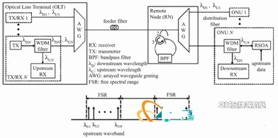 如图5所示,整个网络中仅在OLT存在一个宽带光源,其光谱范围至少覆盖使用波分复用器AWG的两个相邻自由光谱范围(FSR)。在发射端,仅第二个FSR的波长被用来调制信号,下行传输用。由于AWG是典型的线性器件,因此具有环形光谱响应特性,这样在RN,使用解复用器后,对特定的ONU,例如ONUn,将有两个波长输出,如图中标识的λUn和λDn。对每个ONU,通过一个WDM滤波器,将λUn和λDn分开,其中λDn信号被探测解调。而空白波长λUn直接照射在一个反射式的半导体放大器(RSOA)上,用于上行信号调制。这里的RSOA起到三个作用,其实是可以对信号预放大,其二是相当于一个强度直接调制器,对上行信号调制,其三是由于其工作于增益饱和区,因此对噪声具有较强抑制力。图5所示的系统,通常被称为使用RSOA的无色WDM-PON。这里以它为例,主要是因为该模式简单,且原理非常清晰,能够容易的解释无色化的含义。但并不是说该方式是最好的,最起码来说RSOA的调制速率不高,不可能用于超过2.5Gb/s的调制。因此,近年来类似的系统时有报道,原理类似,但采用不同的器件,例如RSOA可换成反射式电吸收调制器等。但这些方法至少从目前来看,都是互有优劣,不存在绝对最佳的方案。