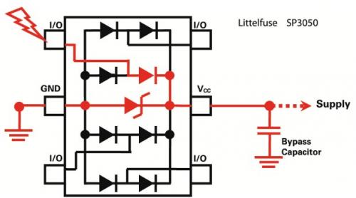至于在大多TVS二极管阵列中常见的剩下的这个引脚,引脚5,Vcc,Littelfuse还建议将其连接至本地电源,如5伏、3.3V电源。(注意:应该确保保护器件的对峙电压(VRWM)远高于电源电压,以防止激活或打开内部TVS二极管。)