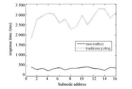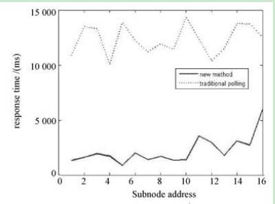 1个主节点、16个从节点、波特率为1 200 b/s、从节点固定帧长度。有实时性要求的紧急数据采用随机产生的方式,产生的时间间隔为1~2 min.对每个从节点从紧急事件产生到获取总线的时间进行计时,得到紧急事件的响应时间,持续运行1 h,然后每个从节点对各自的所有响应时间求平均值。从节点帧长度为25 B的紧急事件平均响应时间如图2所示。其中,实线指示采用上述新方法的测试结果,虚线指示采用传统轮询方式的测试结果。由图可见,采用新方法的所有从节点的平均响应时间在500 ms以内,而采用传统轮询方法从节点平均响应时间都大于1 500 ms,较大的甚至大于3 000 ms,新方法大大提高了系统的实时性。