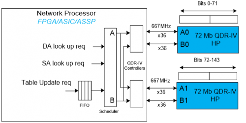以下是使用两个72Mb, X36 QDR-IV HP的存储子系统(运行频率为667Mhz)。这两个QDR存储组成带宽扩展模式,以便每个时钟周期在端口【A0、A1】和端口【B0、B1】支持144bits的数据。调度器在目标地址、源地址读取请求和表写入请求(一次性4次写入)之间做出判断,并将它们发送到端口【A0、A1】或端口【B0、B1】。有足够的带宽来满足所有的请求。通过附加QDR-IV HP存储器进行深度和宽度扩展,还能支持更多的表条目,或支持每条目更多位数。