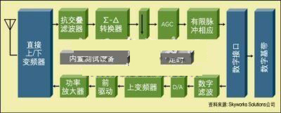 高动态范围A/D靠一个高速采样时钟提供时钟信号,所以在设计和布局阶段必须仔细考虑基底噪音及RF前端的耦合噪声。来自RF采样时钟谐波的干扰如果处在通道带宽之内的话,可能会降低接收器的性能。一旦信号实现了数字化,一个公共的硬件平台可用来提取期望信号,同时阻止干扰信号。几项射频功能,如直流偏移抵消、自动增益控制和频率偏移校正等,在实际的数据解调之前可以作为射频的一部分被执行。这减轻了对DSP指令运算速度方面的要求,同时使无线电控制方式更加灵活。