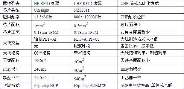 UHF门票芯片与HF门票芯片相比,制造工艺相同,但UHF芯片金属层数少三层、芯片面积少一半,因此UHF客票芯片制造成本比HF客票芯片至少低一半。