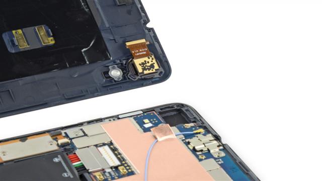 不过,后置摄像头还连在后壳上没有下来,而且是直接给拽下来的。更糟糕的是,接口在主板下方,想重新连接的话需要先拆掉主板。