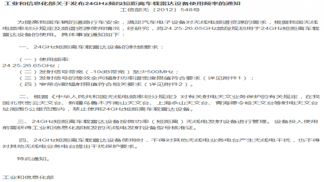 图2. 工业和信息化部关于发布24GHz频段短距离车载雷达设备使用频率的通知。