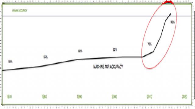 从上图的变化可以看出,2010—2015的五年时间,ASR准确度得到大幅提升,这种变化超过了过去30年到40年的变化。事实上,我们现在已经接近一个时刻:机器对于语音的识别能力即将超过人类。