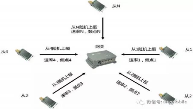 如图3所示,一点对多点通信,多个从节点可同时与中心点通信,从节点可随机上报数据,节点可以根据外界环境和信道阻塞自动采取跳频和速率自适应技术,逻辑上网关可以接收不同速率和不同频点的信号组合,物理上网关可以同时接收8路、16路、32路甚至更多路数据,减少了大量节点上行时冲突的概率。该系统具有极大的延拓性,可单独建网,可交叉组网,LoRa领域内目前主要指的是LoRaWAN技术。