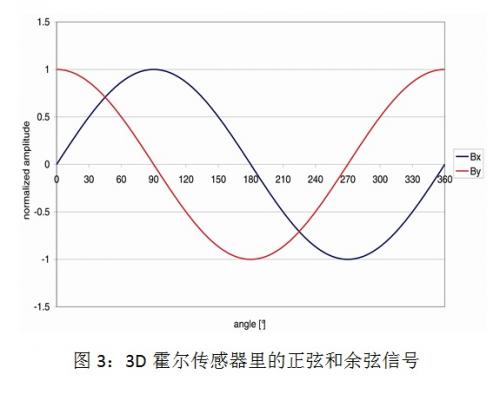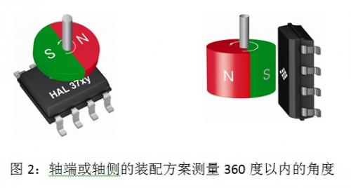 HAL 37xy系列产品同样适用于360度内的角度测量。产品可以在轴端或轴侧适用(图2)。如图3所示,一个360的旋转就带来在Bx和By或者Bx和Bz的一个正弦和一个余弦输出,通过传感器里的DSP就能通过反正切函数计算角度。输出电压是和测量的角度直接成比例。