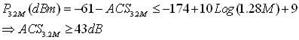 3GPP规定TD-SCDMA终端当存在两个干扰信号,一个为调制类型的干扰信号,在±6.4MHz处,电平为-46dBm,另一个为点频类型干扰信号,在±3.2MHz处,电平为-46dBm,系统灵敏度可下降3dB。如果我们认为灵敏度下降是因为互调产物所导致的,只要该产物功率不大于灵敏度电平时的带内总噪声功率,则该指标就没有问题。假定接收通道噪声系数为标准所要求的最低指标:9dB,由此我们可以推出该指标所要求的等效三阶截止点,该三阶截止点与输入干扰信号的频率偏移量有关,因为接收通道包括信道选择滤波器。