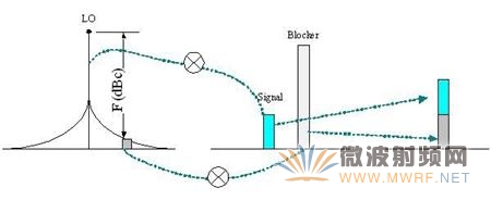 阻塞指标、双音互调指标对系统的影响有一个途径就是倒易混频,图7是一个倒易混频的干扰示意图: