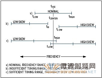 如果在最差情况下,系统提供的调谐电压不足,不能获得足够的频率调谐范围,则期望的振荡频率就无法达到(图5b)。显然,仔细确定调谐范围需求是很有必要的。这可通过以下方法实现,首先计算出所有误差源所引起的频率偏差,然后确定最差情况下的fLOW < fOSC且fHIGH > fOSC (图5c)。