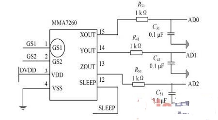 本无线采集系统采用了Freescale 公司最新推出的一款低成本、单芯片、三轴加速度传感器MMA7260。该微型电容式加速传感器融合了信号调理、单极低通滤波器和温度补偿技术,提供了4 种加速度测量范围,分别为±1.5 g , ±2 g , ±4 g 和±6 g。考虑到前文将阈值定为0.2 g ,故设置参数将测量范围定为±1.5 g。在CC1010 与MMA7260 的接口中,首先要考虑噪声问题。因为MMA7260 内部采用了开关电容滤波器, 有时钟噪声产生, 所以需要在MMA7260 的XOU T ,YOU T 和ZOU T 三个输出端分别接RC 滤波器;其次要考虑电压匹配问题,由于x , y , z 轴方向的电压输出是0.45~2.85 V ,CC1010 的ADC 最大输入范围是0~V DD 。此处,V DD = 3.3 V ,其范围恰好在ADC的输入范围之内, 所以不用考虑额外的分压电阻。CC1010 和MMA7260 的接口电路如图3 所示。R31 / C31 , R41 / C41 , R51 / C51 用于滤除MMA7260 内部采样的开关噪声,GS1 ,GS2 用于量程选择。