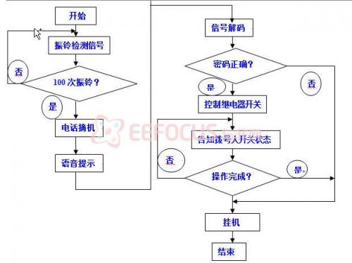 当有电话打入时,振铃检测电路检测到有振铃信号,通过单片机来对振铃信号进行计数。系统判断振铃的次数,达到预设的100次仍没有摘机,单片机就控制模拟摘挂机电路进行自动摘机。同时单片机控制语音提示模块播放语音提示用户输入密码,密码正确就可以进行相应的电器控制,密码不正确就直接挂机。当操作完成后,单片机控制摘挂机电路实行电话挂机,通话结束。若在这100次振铃过程中,主人接通了电话,则控制器不起作用。