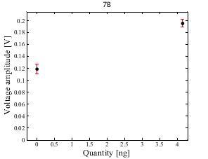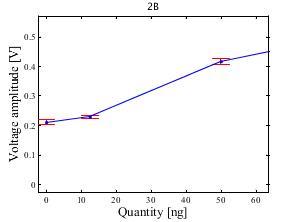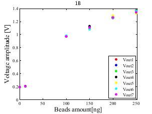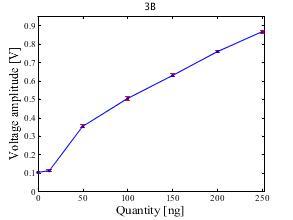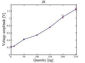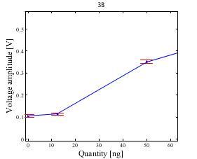 如前文所述,在八种生物传感器的表征实验中,次级大小线圈均被测试。即使八种传感器的响应性、分辨率、不确定性等参数都被测量,因为数据合成的原因,这里只能提供部分实验性表征。图11列出了在次级大线圈上取得的实验数据以及误差柱状图(@ 3sigma),不难看出,输出信号电压随着磁珠质量增加而升高。本图只描述了2B和3B两个传感器的行为特性。