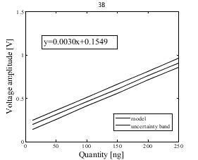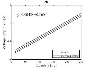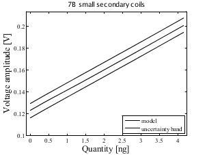因此,在12.5ng以下工作范围,感测系统必须使用次级小线圈;次级大线圈用于磁珠质量大于12.5ng的情况。然后,计算出次级大线圈感测系统的模型,不包括磁珠质量小于12.5的情况。图13所示是2B和3B传感器的线性模型以及不确定性范围;图中还有模型方程式。