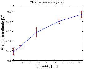 如前文所述,传感器7B的次级小线圈初步表征是使用一滴第一种溶液(4.16 ng)。此外,在工作线圈上放置第二种稀释溶液,以确定传感器对浓度低于4.16 ng的磁珠是否反应。既然次级小线圈感测系统能够测量低质量磁珠,该传感器可用于两种配置:检查特定目标分子是否存在,并通过小线圈信号量化质量更小的目标分子,因为次级大线圈无法测量小质量目标分子。传感器能够耐受两个不同的工作磁场。本文提出的传感器设计共有两个感测系统,因而产生两个不同的工作磁场,但是,根据实际应用情况可能只选用其中一个感测系统。