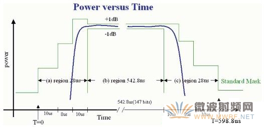 (2)在(b)区域中,PA之输出功率必须维持非常稳定,功率变动范围在±1dB内,否则手机欲传之信号很容易因PA本身功率不稳定,而受到PA的调变,因而产生调变频谱噪声,此将大大提升手机本身通话时之BER(Bit-error-rate),使通话品质不佳。