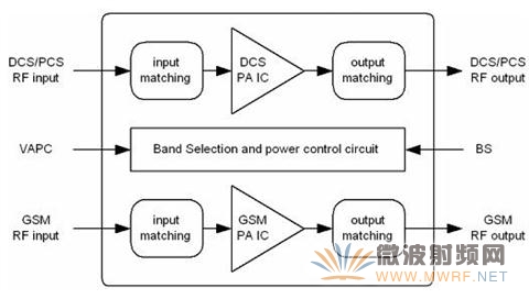 CMOS功率控制IC:此IC可说是PA模块的核心,其功能含:提供HBT IC直流偏压(DC-Bias)、频带选择(Band-Selection betweenGSM and DCSBand)、温度补偿、自我功率测量(确保PA所输出功率为基站需求值),输出功率调整(不同之