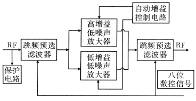 由图1可知,前端电路由保护电路,跳频预选滤波器,低噪声放大器和自动增益控制电路组成。其中保护电路是接收机射频前端能在现代复杂电磁环境下继续良好工作的保障,防止接收机因受强信号而造成损坏;跳频预选滤波器是为了选出接收机的工作频率信号,滤除其他杂波,提高接收机的选择性和抑制性;低噪声放大器实现对接收的微弱信号的不失真放大,提高接收机的灵敏度以及动态范围;AGC电路通过检波器检测与RF信号成正比的信号,并把它整流成DC电压,通过比较器与基准电平比较,然后输入终端,由终端进行控制,以此实现对LNA的增益控制,提高接收机的适应性和稳定性。这是该射频前端设计的一个独到之处。