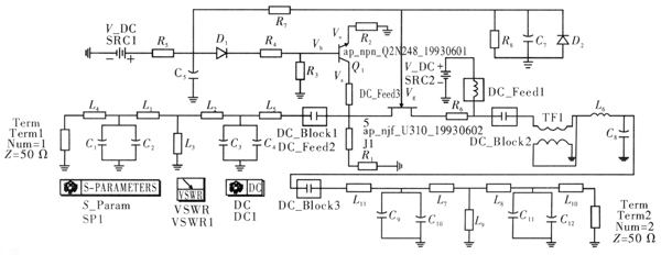 数控跳频预选滤波器的基本作用是对频率有选择地通过,把需要的信号选出来,并抑制不需要的信号。滤波器设计所关心的主要问题是信号通过滤波器所产生的插损大小,相位变化,以及对不希望信号的抑制能力。考虑到设计的接收机工作在30~87.975 MHz的频率范围内,并希望实现全频段覆盖,以及保持有较高的接收灵敏度,因而最好选择使用电调谐滤波器,并且所选电调谐滤波器应具有较宽的调谐范围,较快的电调谐速度和较高的Q值以实现频率预选。本项目所设计的数控跳频预选滤波器是采用逻辑芯片控制电容器组的方法来实现滤波器中心频率调谐的双调谐滤波器。在ADS中的连接图,如图4所示,通过调谐控件对电容C01,C02的容值进行改变得到对选用不同的电容器组的滤波器进行仿真。