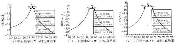从图5中(a),(b),(c)的仿真结果中可以看出,中心频率为86.5 MHz时滤波器的带宽为3.9 MHz,插入损耗为5.352 dB。中心频率为60.5 MHz时滤波器的带宽为2.6 MHz,插入损耗为4.375 dB。中心频率为30.0 MHz时滤波器的带宽为1.5 MHz,插入损耗为5.764 dB。带宽和插入损耗在各频率点上出现不同的值,原因之一是通过改变电容值来改变中心频率,另一个原因是在仿真的过程中,把L3设定为一个固定值,因而在频率的高端出现了过耦合现象,频率的低端出现了欠耦合。实际电路设计时,L3是电感L1、L2的寄生电感,其值是在变化的。从仿真结果中还可以看出通过滤波器所得的频率响应是不对称的,信号在高于中心频率处的衰减速度要大于在低于中心频率处,这是因为所设计的跳频预选滤波器是通过电感耦合造成的,如果使用的是电容耦合则得到与仿真结果成镜像关系。总的来说,所设计的跳频预先滤波器的带内插损和带宽都达到了系统的设计要求,其中插损(4~6 dB)、带宽(1~4 MHz),较好的实现了选频滤波作用。