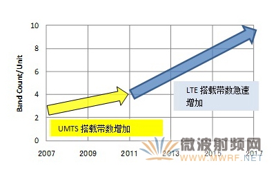 3G技术只是一种上行和下行达到数Mbps程度的速度,但是LTE却以上行50Mbps以上,下行100Mbps以上的速度,达到了与固定通信网络速度相同的目标。GSM/UMTS对应终端中,通常都是GSM搭载4个,UMTS搭载2-4个频带,如果要对应LTE的话还会再追加1-2个频带。图1是移动设备中搭载的平均频带数的推测图。网络上的通信量增大的同时,保证了通信容量、通信频率,LTE频带的搭载数量预测也将迅速增加。