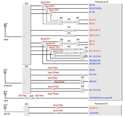 图2、GSM/UMTS/LTE对应终端的前端配置的示例图