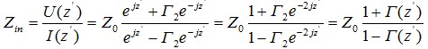 终端接负载阻抗时,则从距终端为z′处向负载方向看过去的阻抗为输入阻抗,定义为该点的电压U(z')与电流I(z')之比,并用Zin表示。
