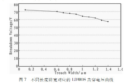 通过进一步仿真实验发现,器件耐压性能与阱宽及阱深的尺寸有关。保持漂移区长度不变,阱宽为固定值0.5μm,图6为不同长度阱深对应的器件击穿电压曲线。从图6中可以看出,随着阱深的加大,器件的抗击穿能力加强,这是由于阱深越大,耗尽区俞难越过阱区,且体硅中承受的最大电场的范围越大,LDMOS的耐压就越高。