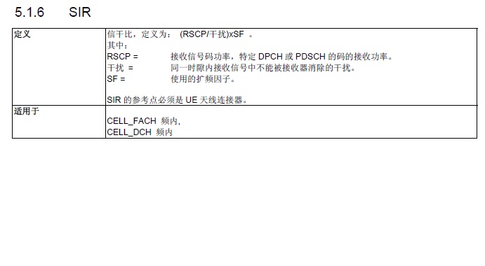 信号干扰比 Signal to Interference Ratio定义为(RSCP/Interference)×SF。这里针对的下行信号RSCP为DPCH或者PDSCH信道上接收信号码功率; Interference为在RSCP测量的时隙上不能被接收机消除的干扰;具体获取方法依赖于具体的设备。目前pecker取的是对应时隙的ISCP作为Interference。SF为使用的扩频因子转换为dB,计算公式为:SIR( dB ) = RSCP(dBm)- ISCP(dBm) + 10log(SF)。 如果UE占用了多个下行时隙,那么这里给出的是第一个时隙的SIR。 C/I代表的是邻频干扰就是同一设备接受到的有用信号码功率和干扰信号码功率之比。即PCCPCH C/I = PCCPCH RSCP(dB) - ISCP[0] 其中ISCP是干扰信号码功率,在特定时隙内的midamble上测量的接收信号中的干扰。ISCP的参考点必须是Rx天线连接器。S:@ P-CCPCH RSCP 是基本公共控制物理信道(Primary Common Control Physical Channel )接收信号的码功率(Received Signal Code Power ),本小区或相邻小区P-CCPCH的接收功率。参考点必须是UE天线连接器。.