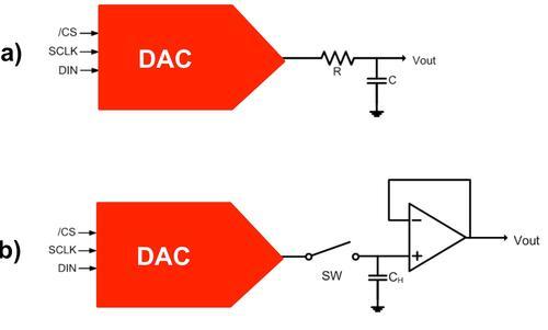 如果存在DAC短时毛刺脉冲干扰问题,用户可以使用外部组件来减小毛刺脉冲幅度(图7a),或者完全消除短时毛刺脉冲干扰能量(图7b。)