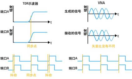 为了测试在多个传输通道之间的信号的时序偏差,需要在各个通道的测量结果之间进行时间同步。VNA和TDR示波器对测量结果进行同步的方法并不相同。本章节将讨论不同方法对测量精度的影响。图 11对比了 VNA和 TDR示波器测量多端口器件时使用的激励信号。TDR示波器为每个端口提供激励源,并独立生成阶跃激励。因此,必须要激励信号同步起来才可以测量不同通道间信号的时序偏差。如果激励信号在某个时间点实现同步,该激励的任意时间波动将导致测量结果中出现抖动。