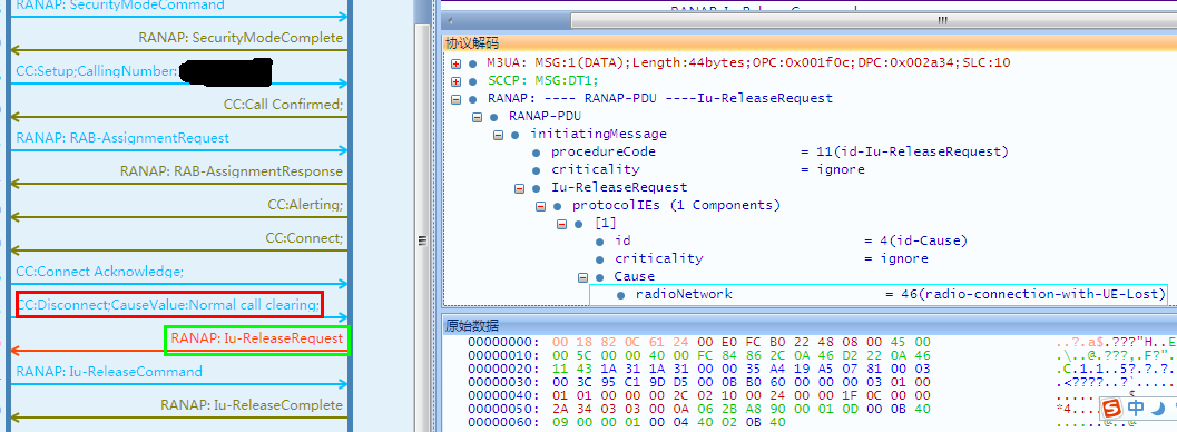 呼叫控制(CC)显示正常断连,而在之后的IU释放却显示有错误(与终端无线连接丢失)