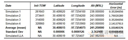 此外,若要量测 TTFF,我们亦可依不同的 TOW 建立仿真作业,以计算 LLA 的精确度与可重复性。请注意,由于在数个小时之内,可用的卫星讯号将持续变化,因此必须设定多种 TOW 以测试精确度 (如图 24)。而图 25 则表示其 LLA 信息。