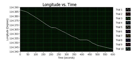 一旦我们完成 GPS 讯号的记录作业,即可透过相同的测试数据重复测试接收器。在下方的说明中,我们追踪接收器的经度、纬度,与速度。透过串行端口与每秒 1 次的 NMEA-183 指令读取速率,从接收器读取所需的数据。在下方量测中,我们所呈现的接收器特性参数,仅有定位与卫星 C/N 值。请注意,在执行这些量测作业的同时,亦可分析其他信息。虽然下列结果中并未量测水平精确度衰减 (Horizontal dilution of precision,HDOP),但此特性参数亦可提供大量的接收器定位精确度信息。